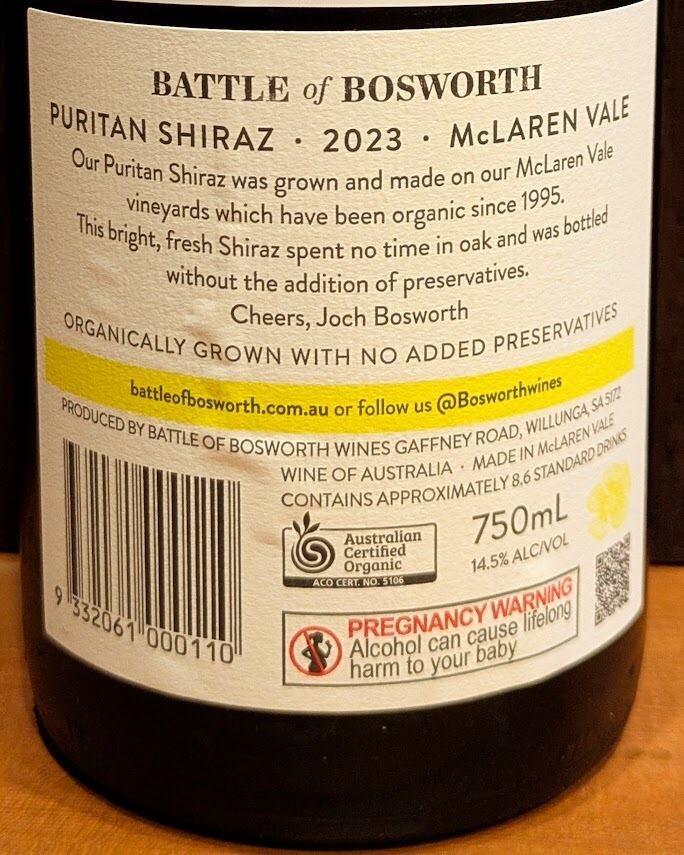 BATTLE OF BOSWORTH Puritan' Shiraz {no added preservative}